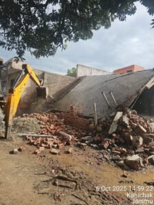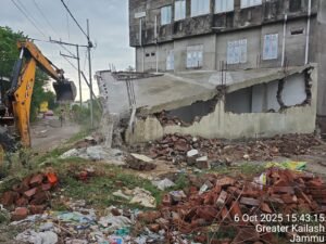 Jammu, October 6:On the directions of the Commissioner, Jammu Municipal Corporation (JMC), Dr. Devansh Yadav, Under the direct supervision of the Joint Commissioner (R&E) Subah Mehta and Deputy Commissioner (South) JMC, Lal Chand today carried out a major demolition drive against illegal building structures constructed without requisite permissions, reaffirming its commitment to ensuring planned and lawful urban development in the city.